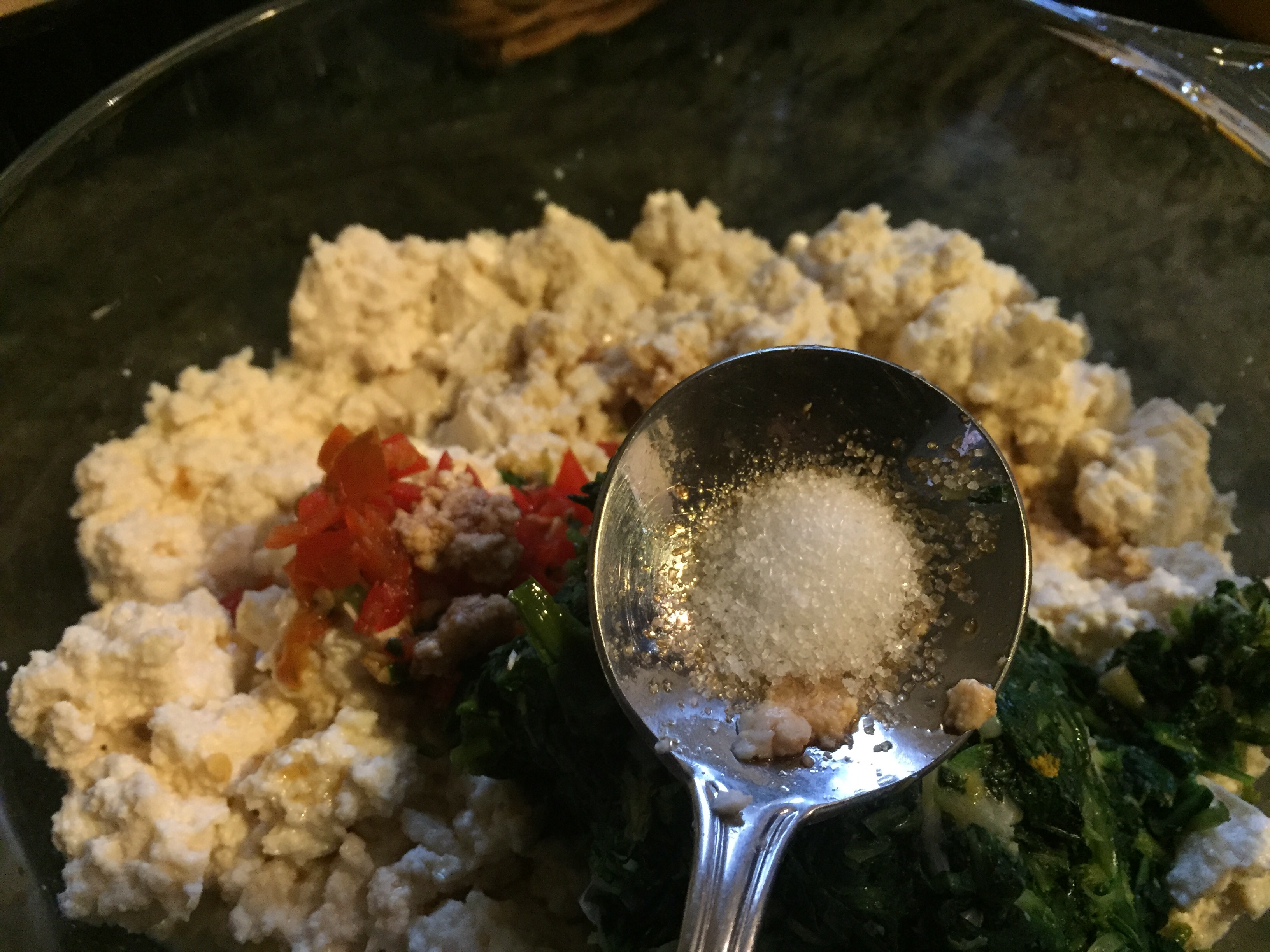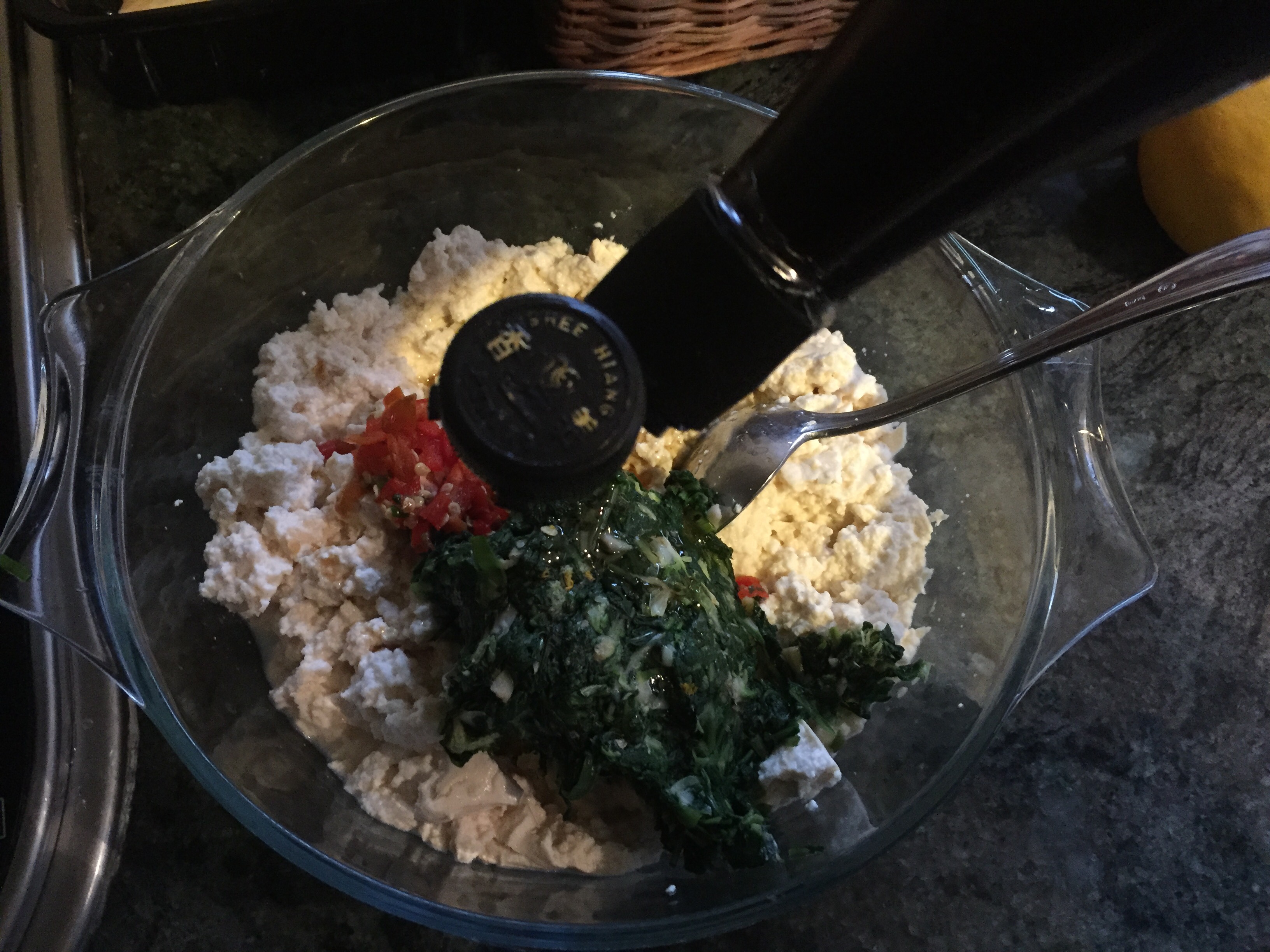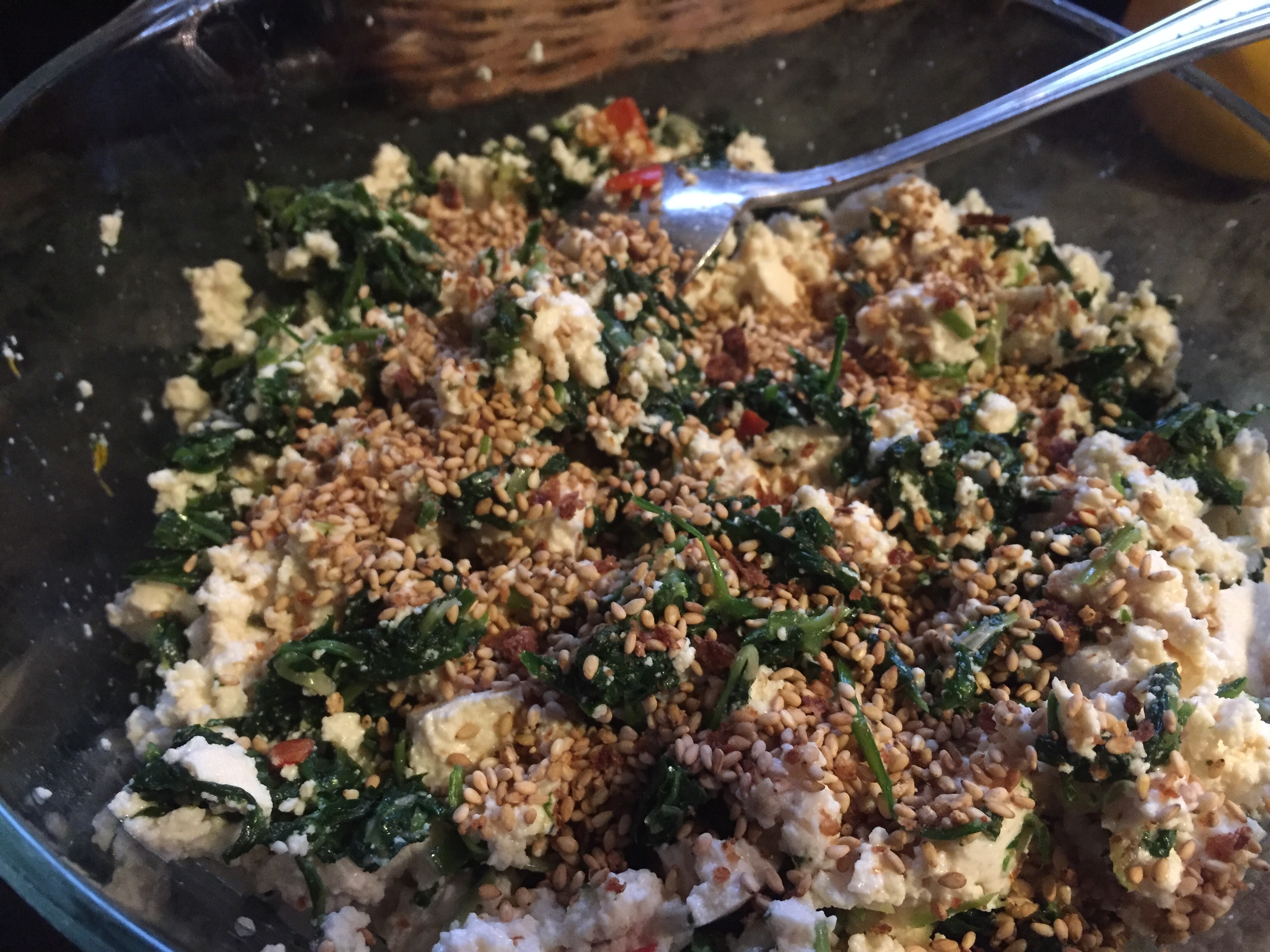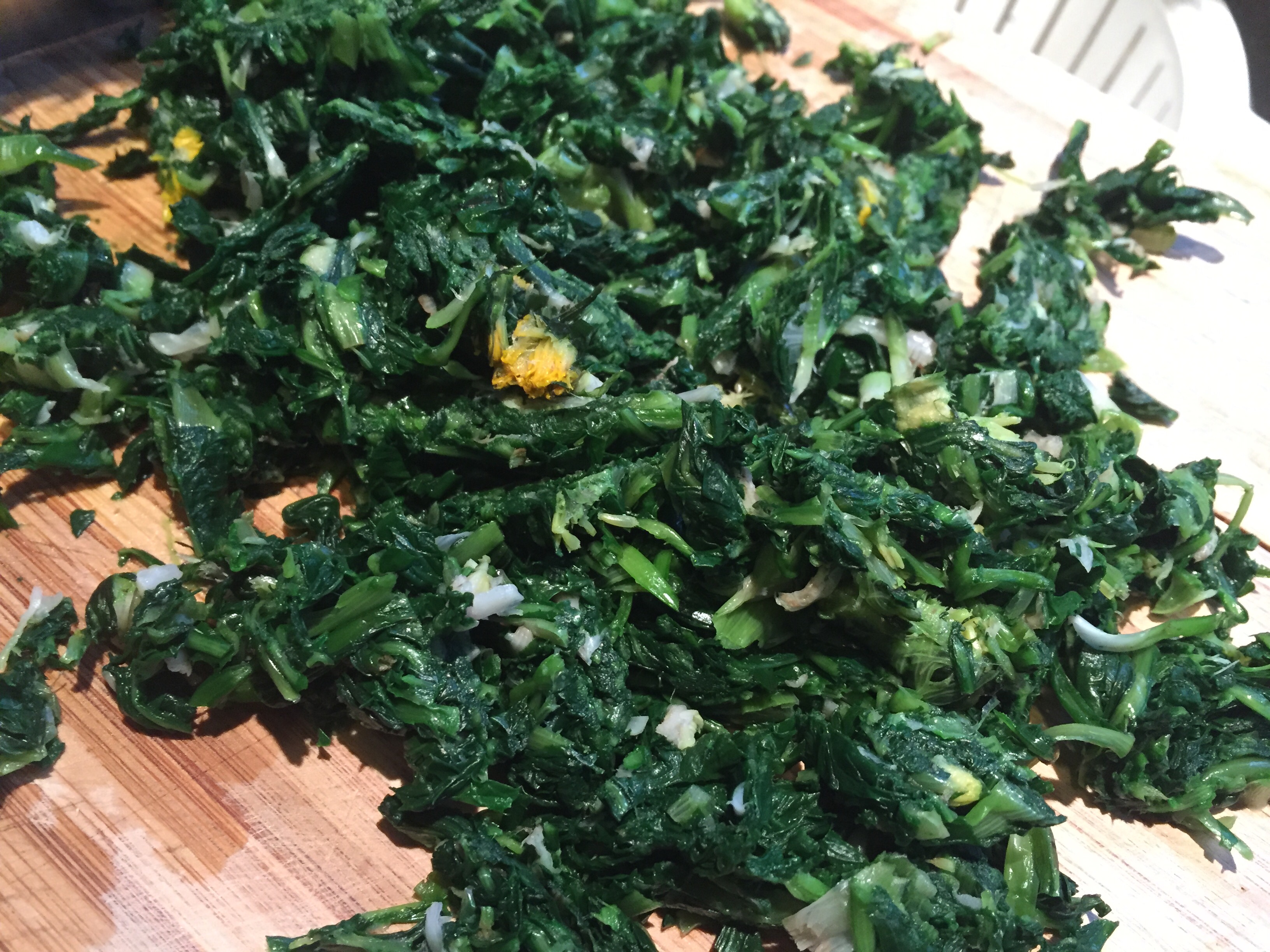 9. Mix cut Dandelion with tofu. Add sesame oil.